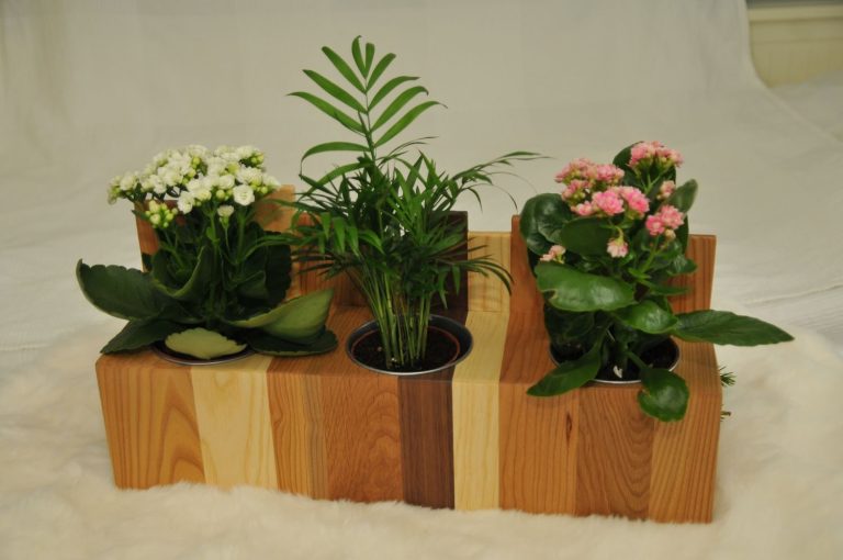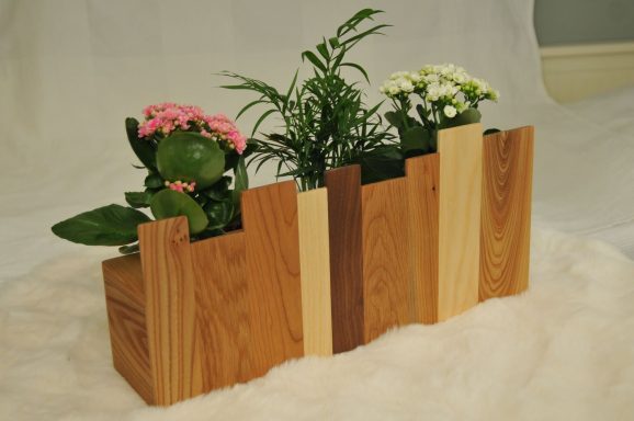 Blomlåda city skyline tillverkas av en mix av olika träslag och i storlek efter önskemål. Blomlåda city skyline på bilden är tillverkat i valnöt, ek, ask och alm. Dimension på blomlådan är ca 20x50cm och 13cm djup. Blomkrukorna är tillverkade i galvaniserad plåt med diameter 11cm men kan anpassas efter önskemål.
