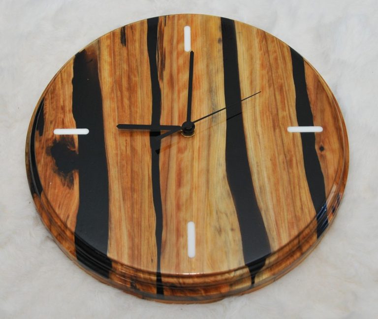 Klocka i en med inslag av svart epoxy och med timmarkering i vit epoxy.