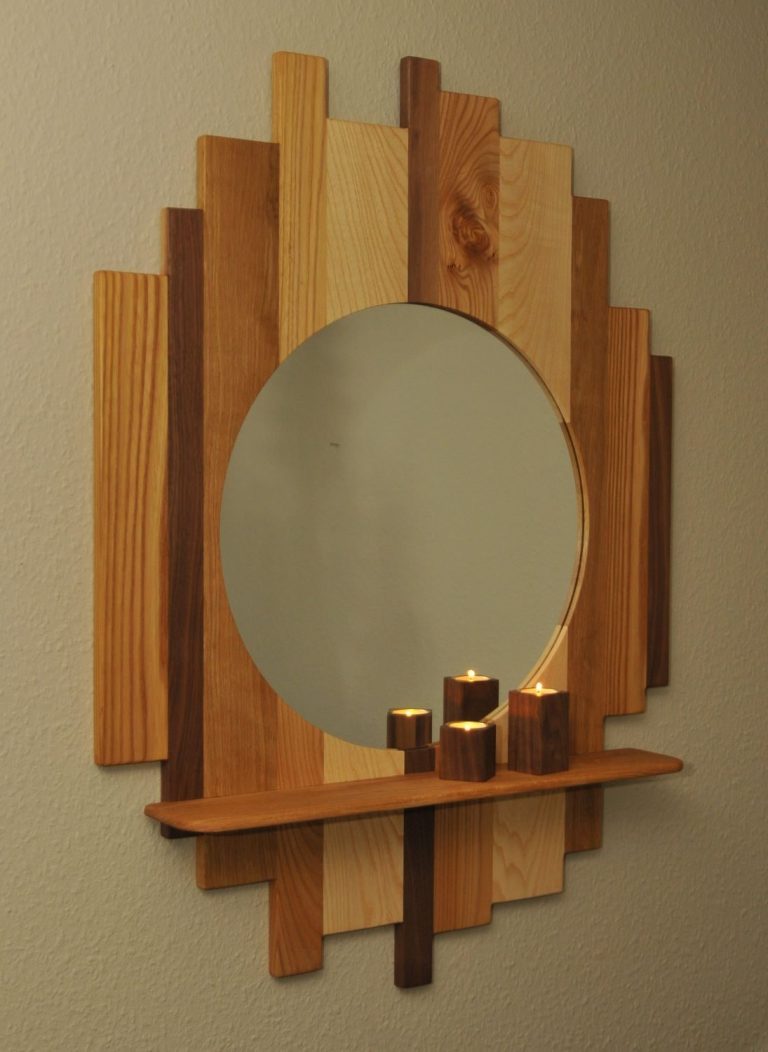 Spegel city skyline tillverkas av en mix av olika träslag och i storlek efter önskemål. Spegel city skyline på bilden är tillverkat i valnöt, ek, ask och alm med hyllplan i ek. Dimension på bakstycket är ca 70x100cm och hyllplanet är 60cm brett och ca 10cm djupt. Spegeln på bilden är 48cm i diameter.