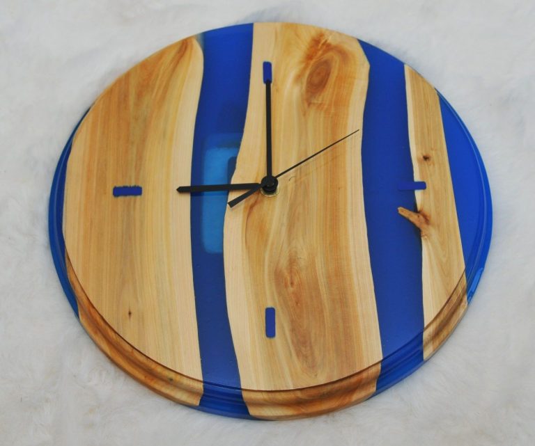 Klocka i en med inslag av blå epoxy och med timmarkering i mörkblå epoxy.