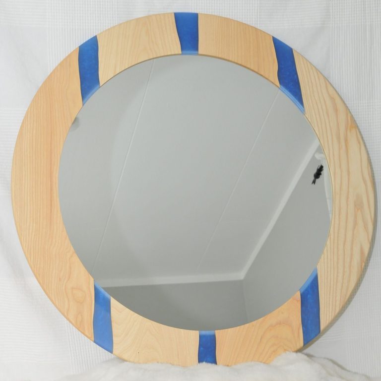 Spegel klarälven tillverkas av träslag och färgkombination efter önskemål. Spegel klarälven på bilden är tillverkat i ask och med blå epoxy. Ytterdiameter på träramen är 85cm och spegeln 63cm i diameter. Spegeln är ca 2 cm från väggen och bakstycket är försedd med led-ljus som kan ändra färg & ljusstyrka efter önskemål, timer mm styrs från app i telefon eller on/off på medföljande strömbrytare.