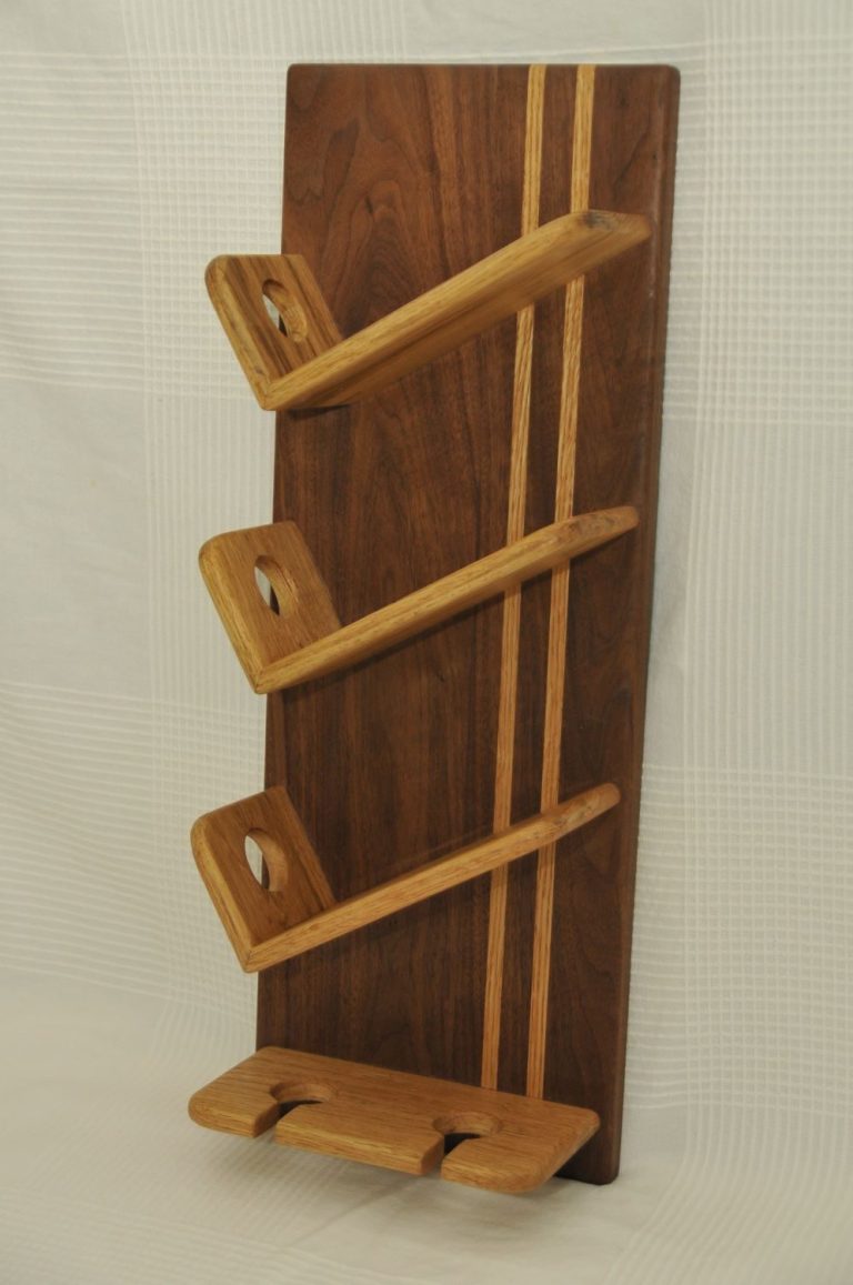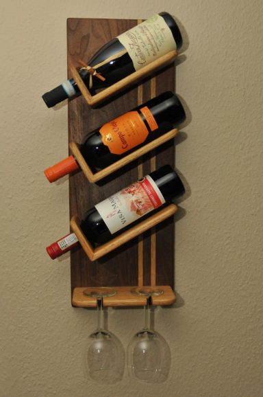 Vinställen tillverkas efter önskemål om antal flaskor, glas och träslag i hyllplan/bakstycke. Vinstället på bilden är tillverkat för tre flaskor med plats för två glas och är gjort i valnöt med hyllplan i ek. Dimensionen är 20x60cm och djup ca 10cm.