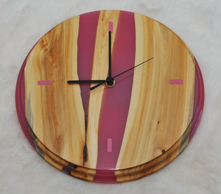 Klocka i en med inslag av rosa epoxy och med timmarkering i rosa epoxy.