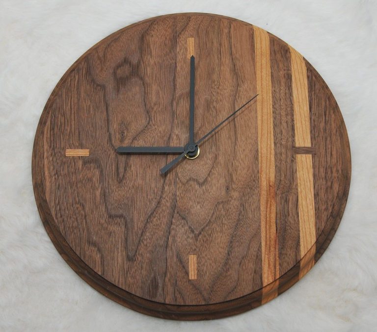 Klocka i valnöt med inslag av körsbär och med timmarkering i körsbär & valnöt