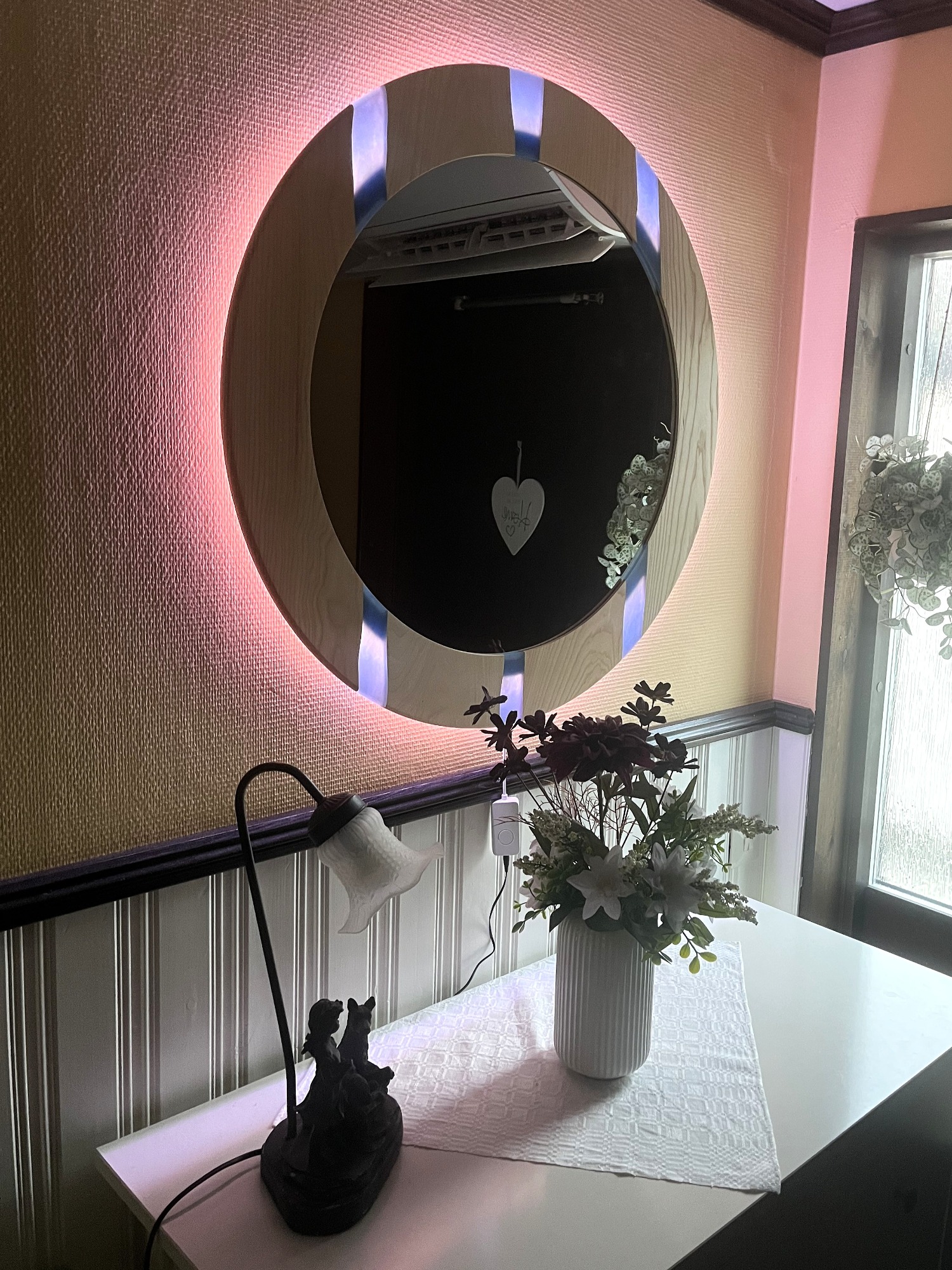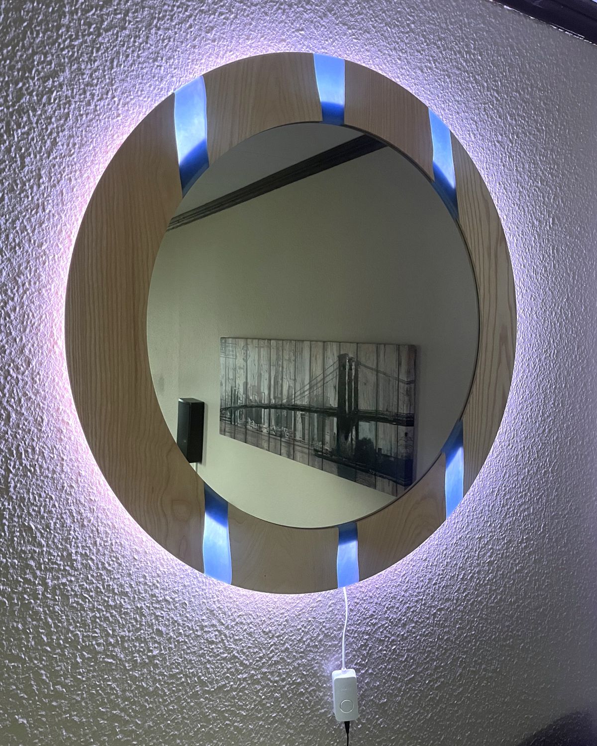 Spegel klarälven tillverkas av träslag och färgkombination efter önskemål. Spegel klarälven på bilden är tillverkat i ask och med blå epoxy. Ytterdiameter på träramen är 85cm och spegeln 63cm i diameter. Spegeln är ca 2 cm från väggen och bakstycket är försedd med led-ljus som kan ändra färg & ljusstyrka efter önskemål, timer mm styrs från app i telefon eller on/off på medföljande strömbrytare.