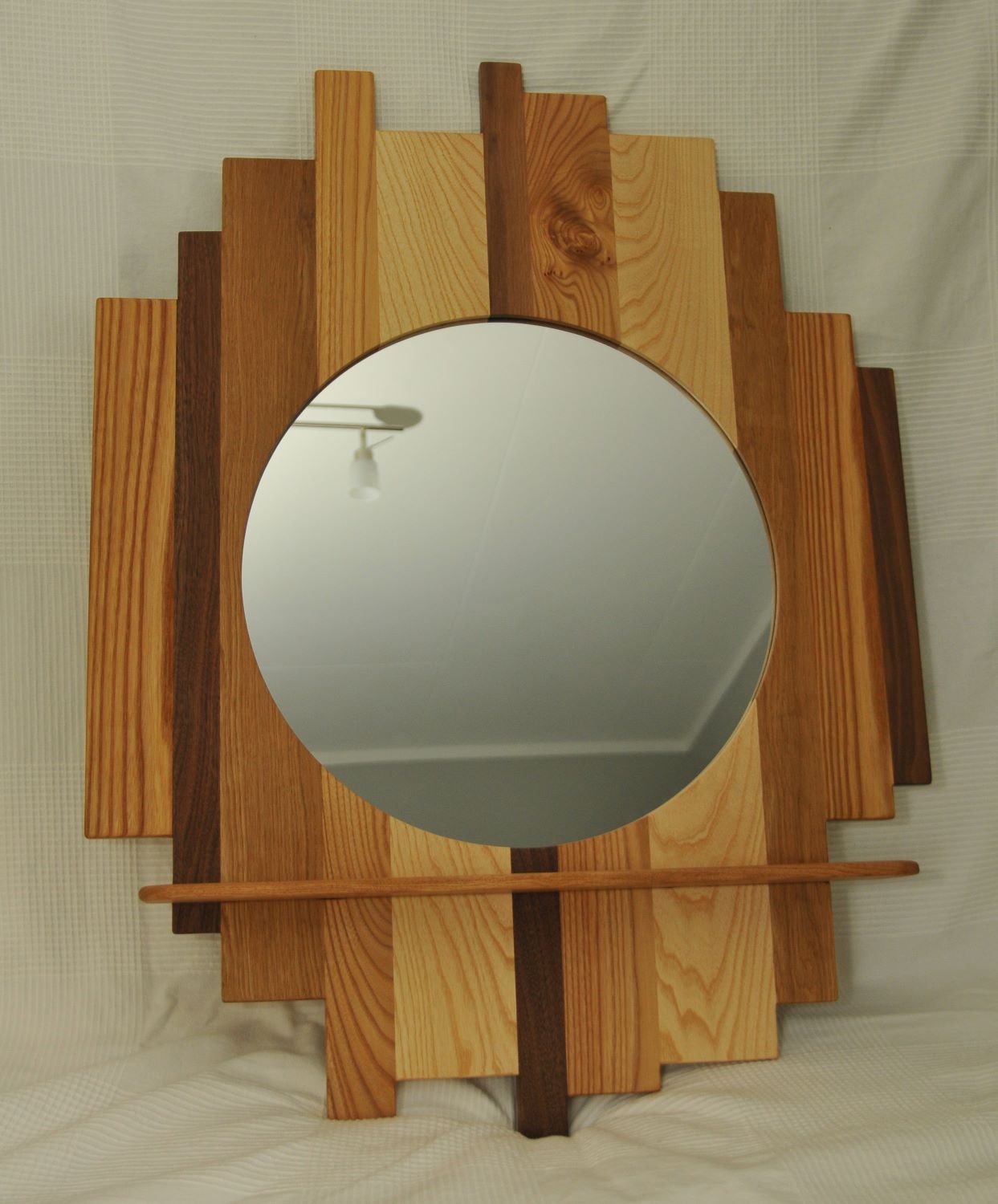 Spegel city skyline tillverkas av en mix av olika träslag och i storlek efter önskemål. Spegel city skyline på bilden är tillverkat i valnöt, ek, ask och alm med hyllplan i ek. Dimension på bakstycket är ca 70x100cm och hyllplanet är 60cm brett och ca 10cm djupt. Spegeln på bilden är 48cm i diameter.