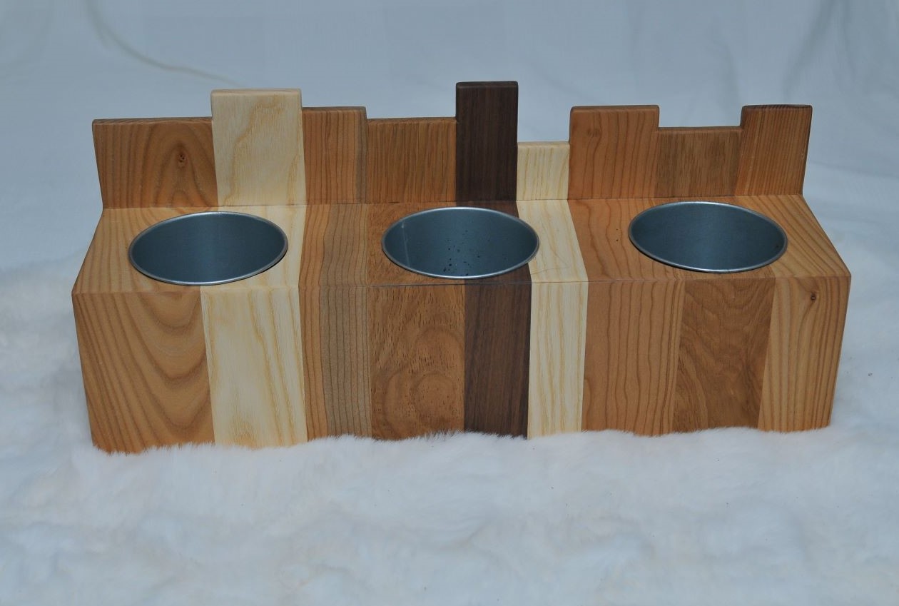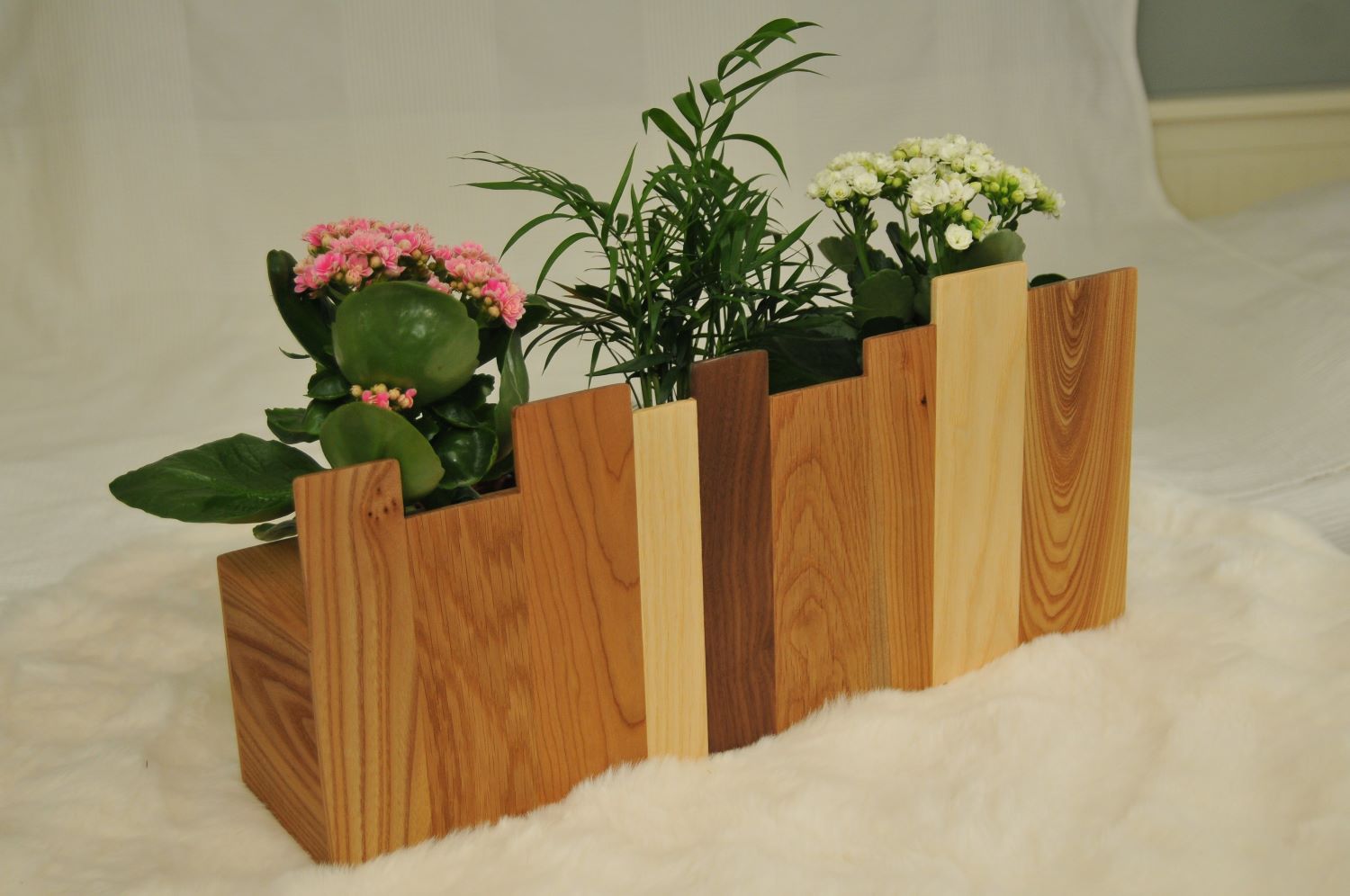 Blomlåda city skyline tillverkas av en mix av olika träslag och i storlek efter önskemål. Blomlåda city skyline på bilden är tillverkat i valnöt, ek, ask och alm. Dimension på blomlådan är ca 20x50cm och 13cm djup. Blomkrukorna är tillverkade i galvaniserad plåt med diameter 11cm men kan anpassas efter önskemål.