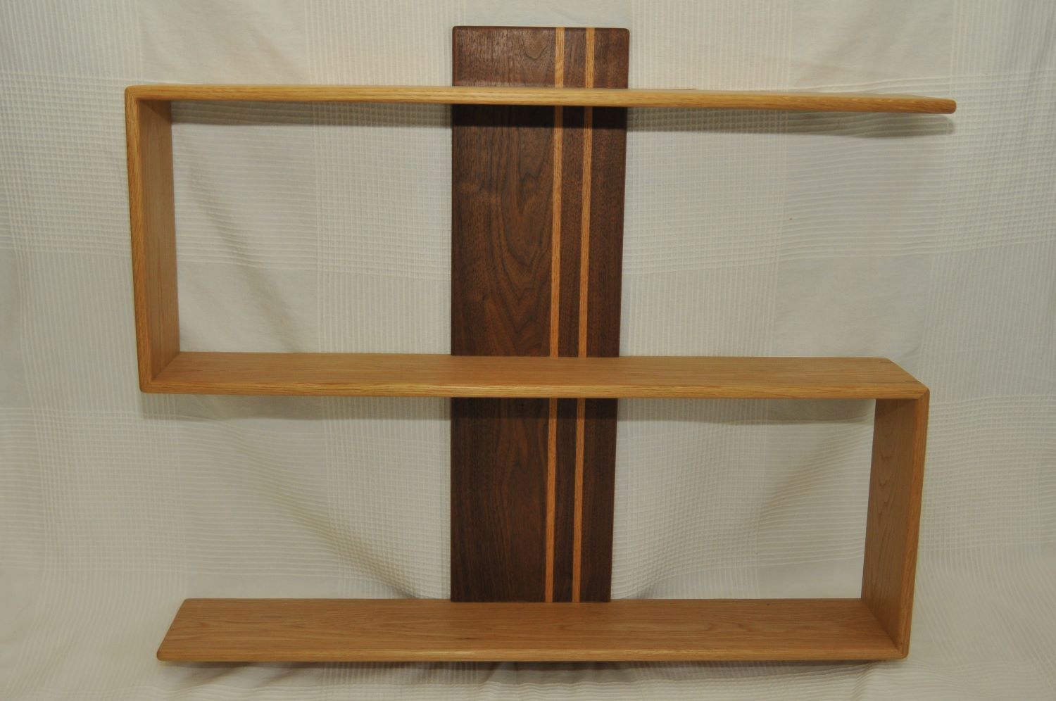 Hylla S tillverkas efter önskemål om storlek och träslag i hyllplan/bakstycke. Hylla S på bilden är tillverkat i valnöt med hyllplan i ek. Dimension på bakstycket är ca 20x70cm och hyllplanen är 80cm breda och ca 14cm djupa och ca 30cm isär.