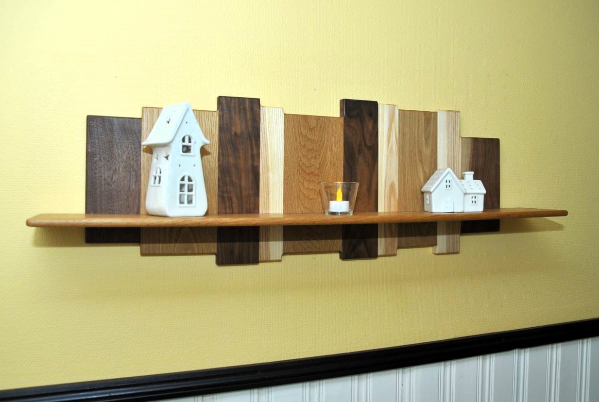 Hylla city skyline tillverkas av en mix av olika träslag och i storlek efter önskemål. Hylla city skyline på bilden är tillverkat i valnöt, ek, ask och alm med hyllplan i ek. Dimension på bakstycket är ca 30x90cm och hyllplanet är 100cm brett och ca 15cm djupt.